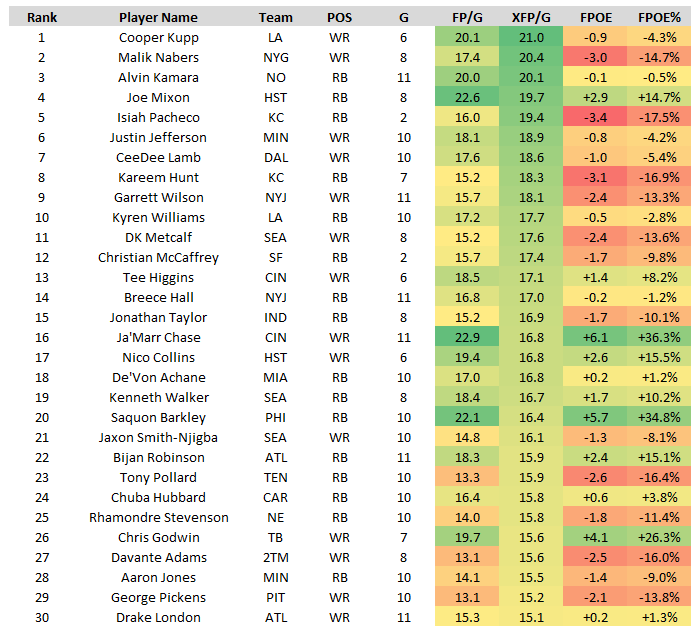 The top 30 players in expected fantasy points (XFP) per game through Week 11